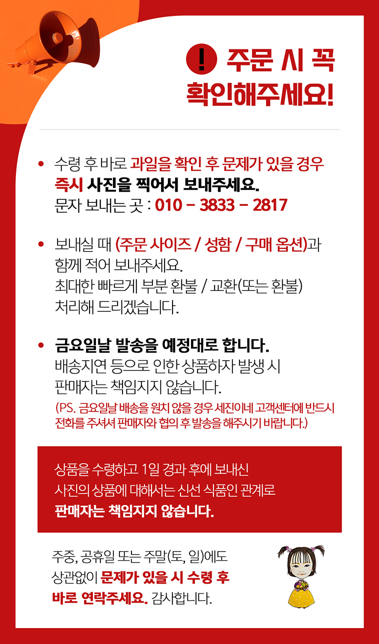 안내말씀 : 많은 옵션이 있으나 최상위 옵션이 품절일 경우에만 구매자님께 전화를 드리며 이하 상위 옵션은 전화없이 발송됨을 알려드립니다.