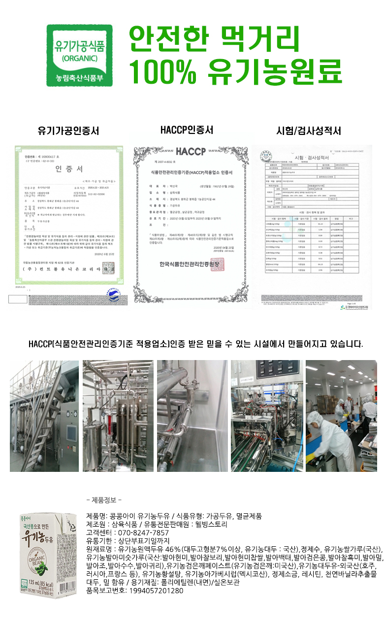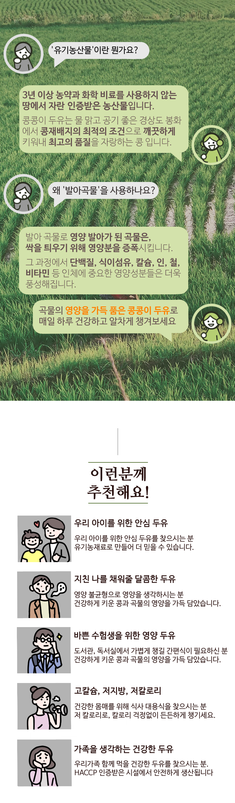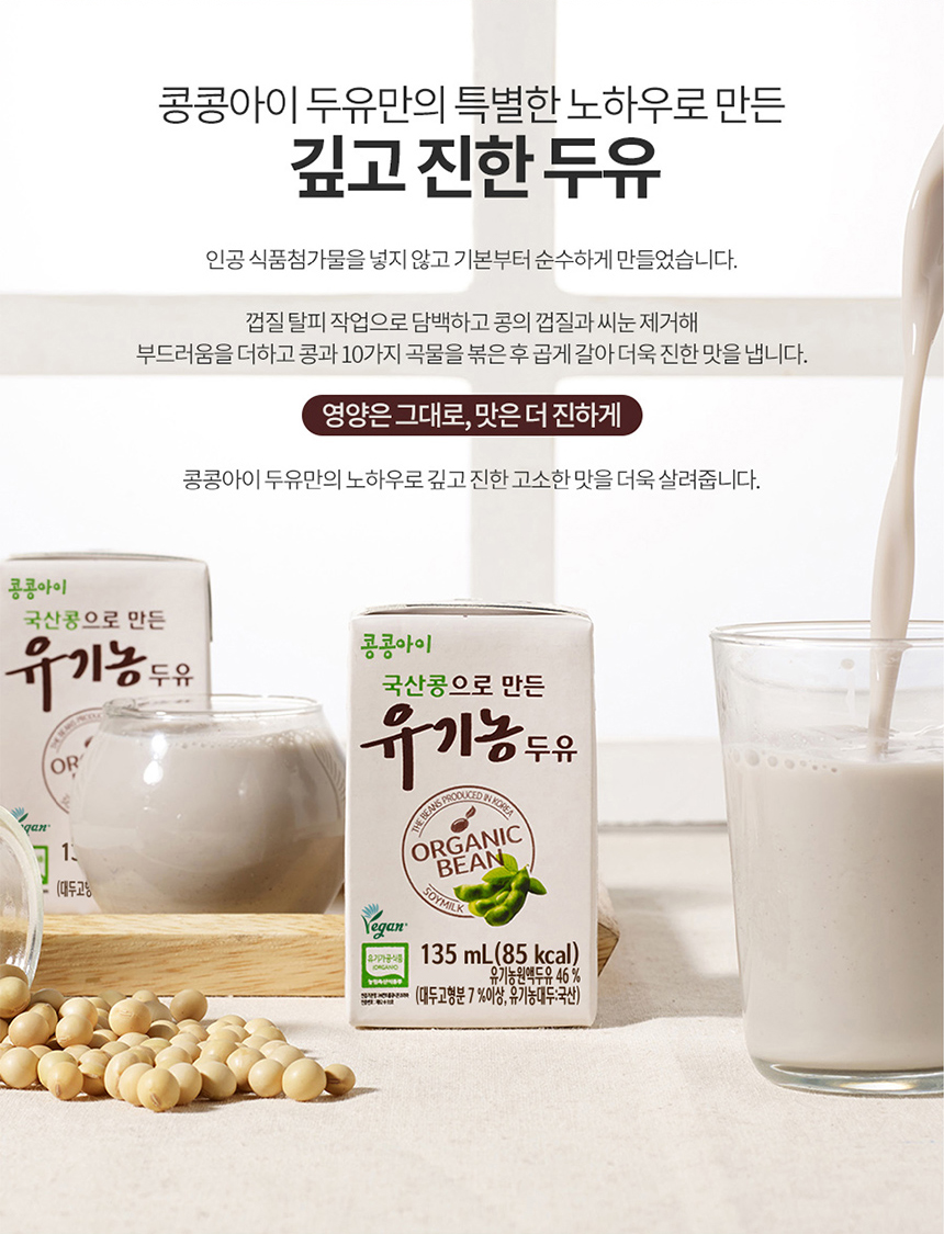 유기농원액두유 46%(대두고형분7%이상, 유기농대두 : 국산), 정제수, 유기농쌀가루(국산), 유기농발아미숫가루(국산:발아현미, 발아찰보리, 발아현미찹쌀, 발아백태, 발아검은콩, 발아찰흑미, 발아밀, 발아조, 발아수수, 발아귀리), 유기농검은깨페이스트(유기농검은깨:미국산), 유기농대두유-외국산(호주, 러시아, 프랑스등), 유기농황설탕, 유기농아가베시럽(맥시코산), 정제소금, 레시틴, 천연바닐라추출물 대두, 밀 함유