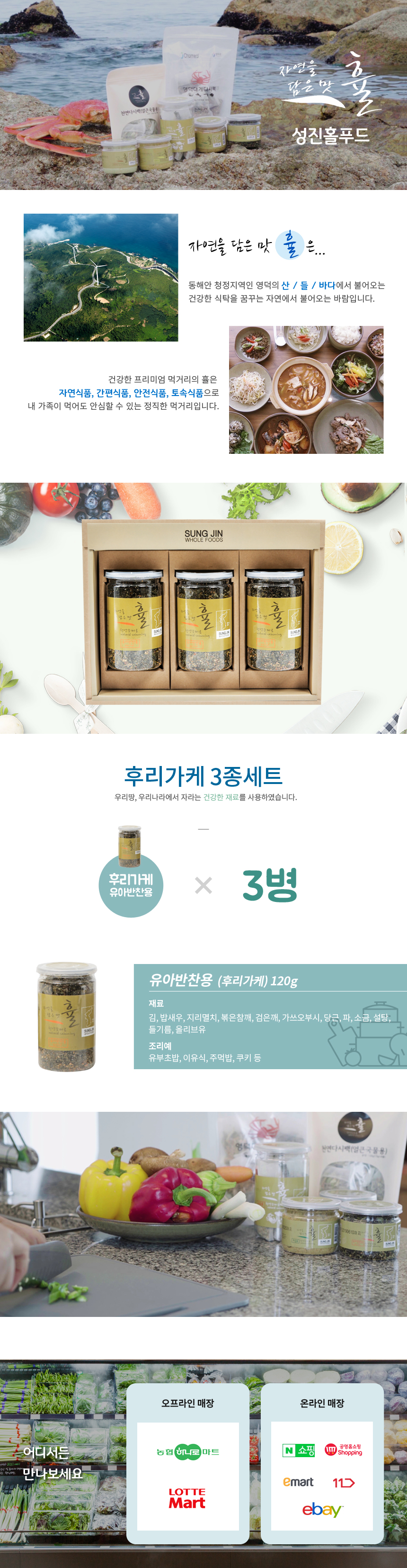 파래김(국내산)33.3%, 세세멸치(국내산), 밥새우(국내산), 대파(국내산), 당근(국내산), 가쓰오부시(수입산), 참깨(수입산), 흑임자(수입산), 꽃소금(국내산), 설탕(국내산), 들기름(수입산), 올리브오일(수입산)