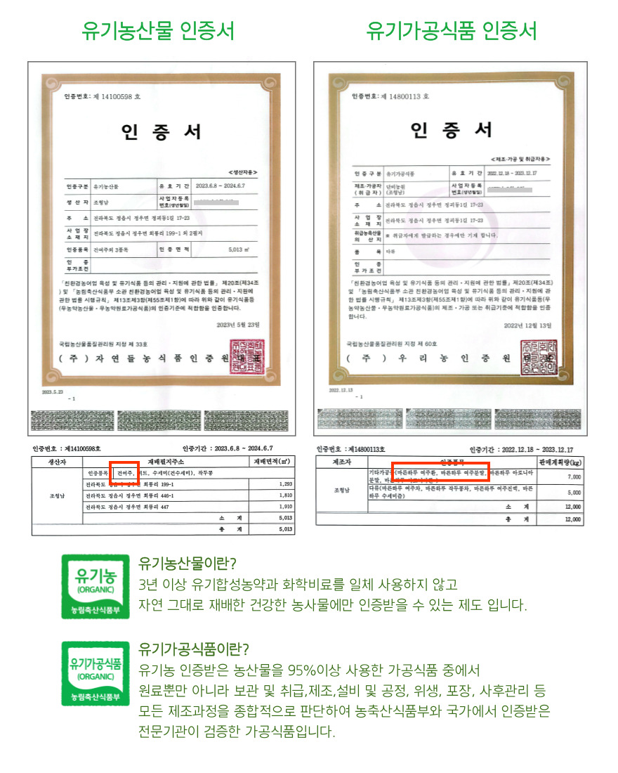 [유기농, 유기가공식품, HACCP, 국산, 無화학첨가]