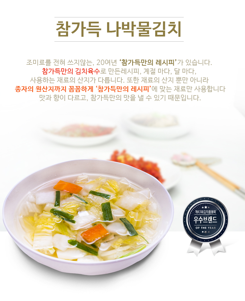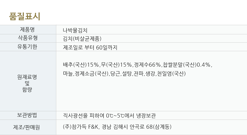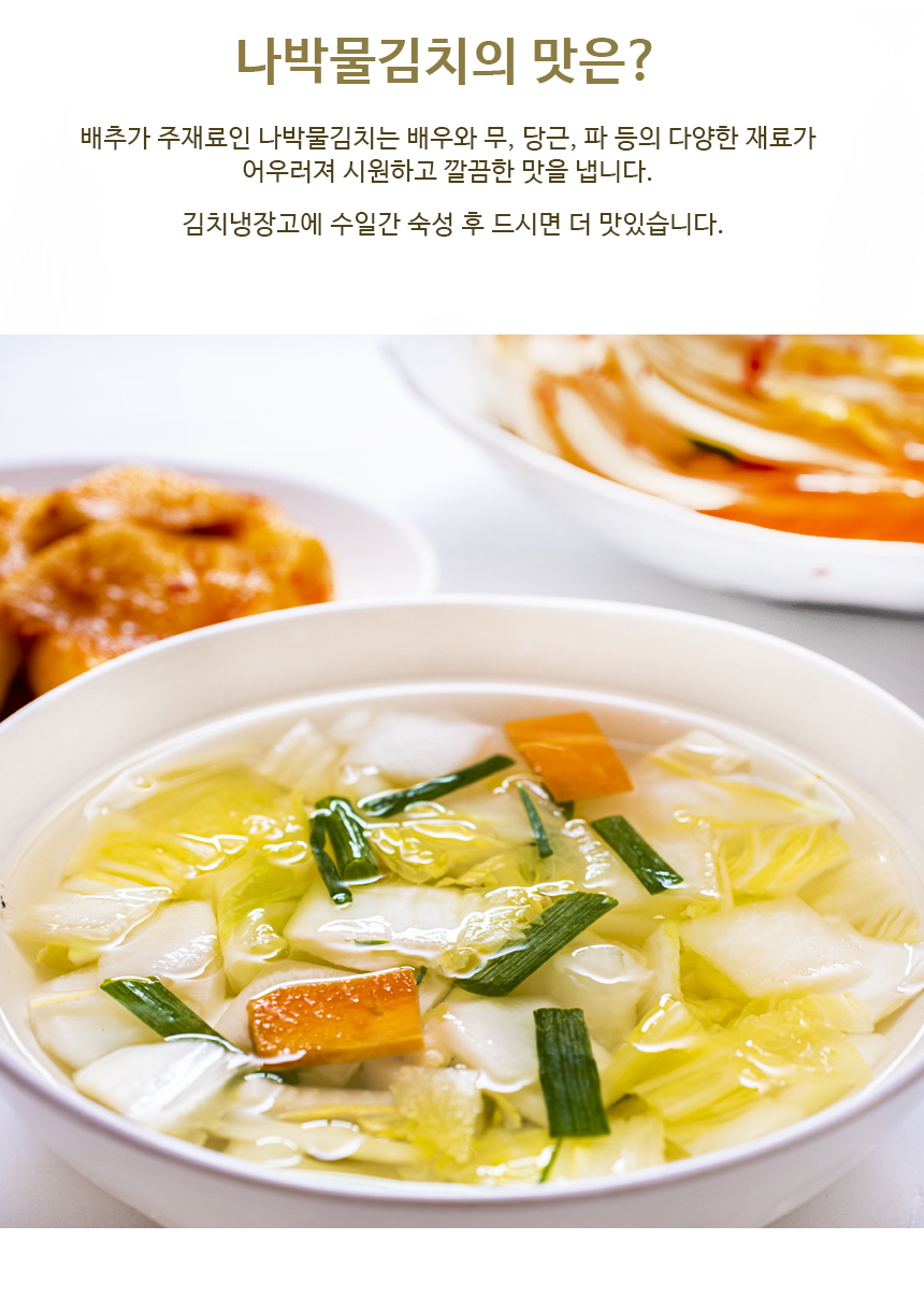 배추(국산)15%,무(국산)15%,정제수66%,찹쌀분말(국산)0.4%,마늘,정제소금(국산),당근,설탕,잔파,생강,천일염(국산)