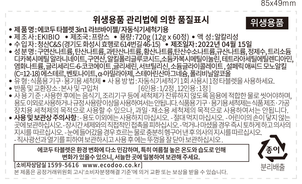 • 에코두 식기세척기세제 타블렛 3in1 720g(12g*60)