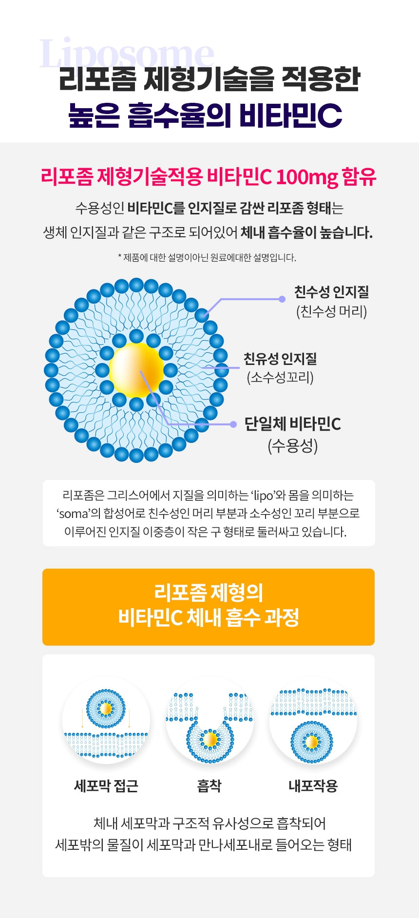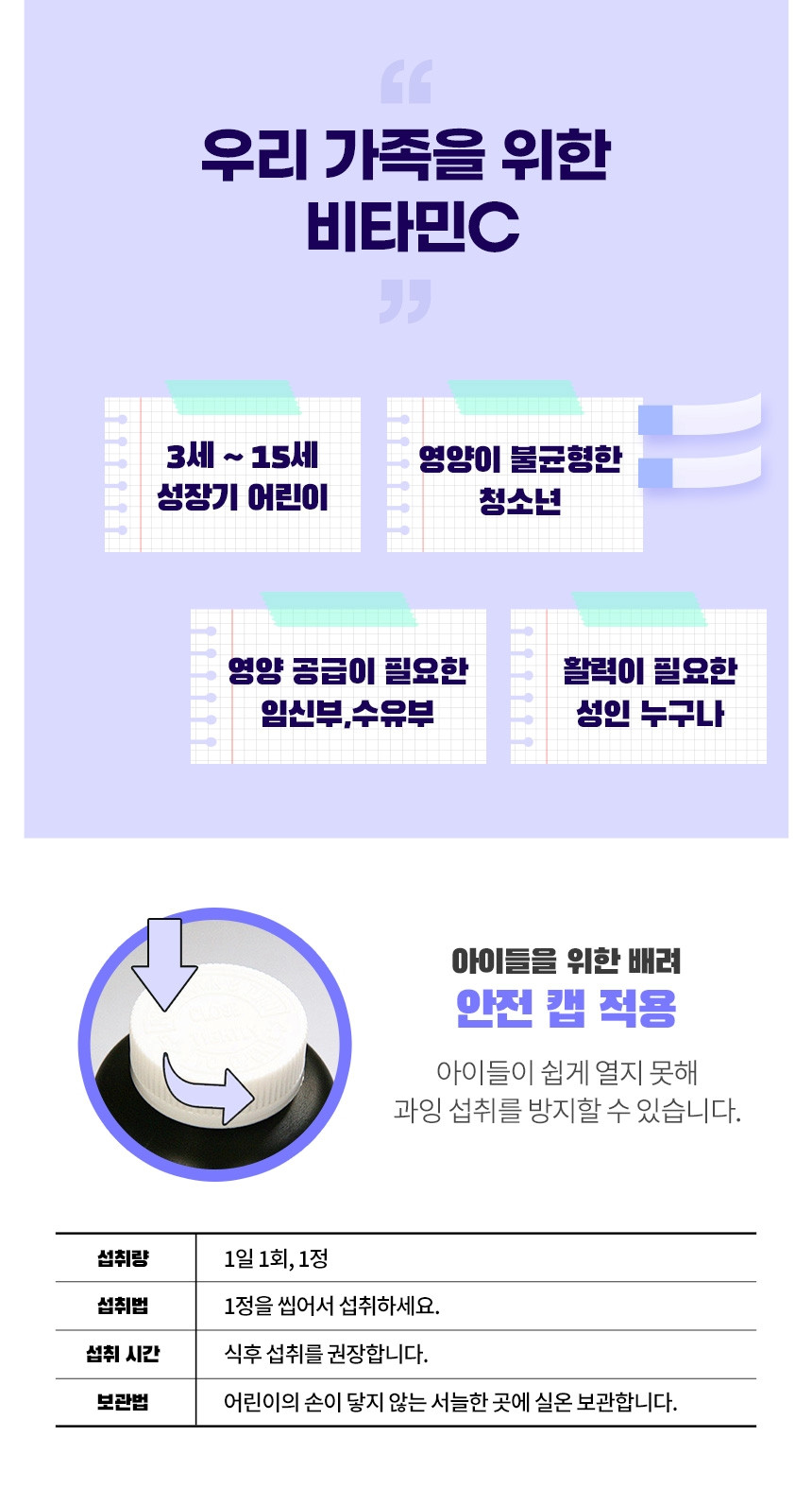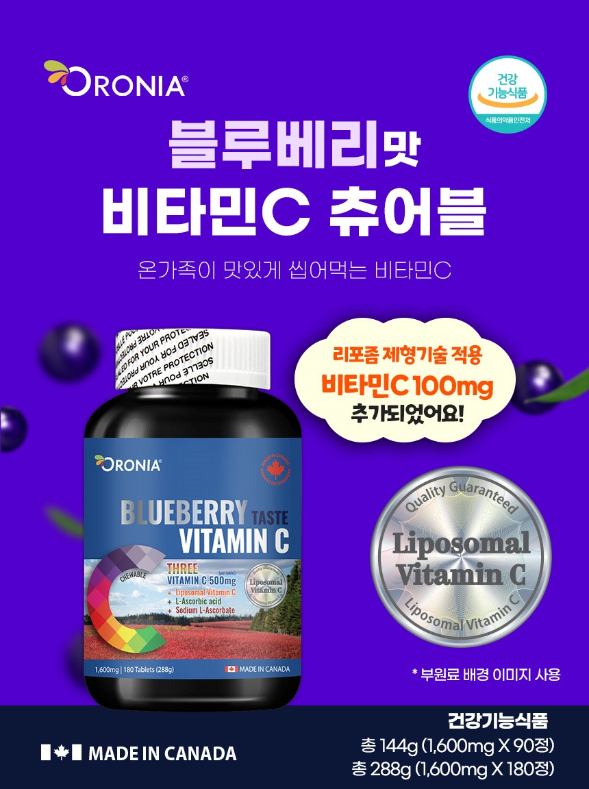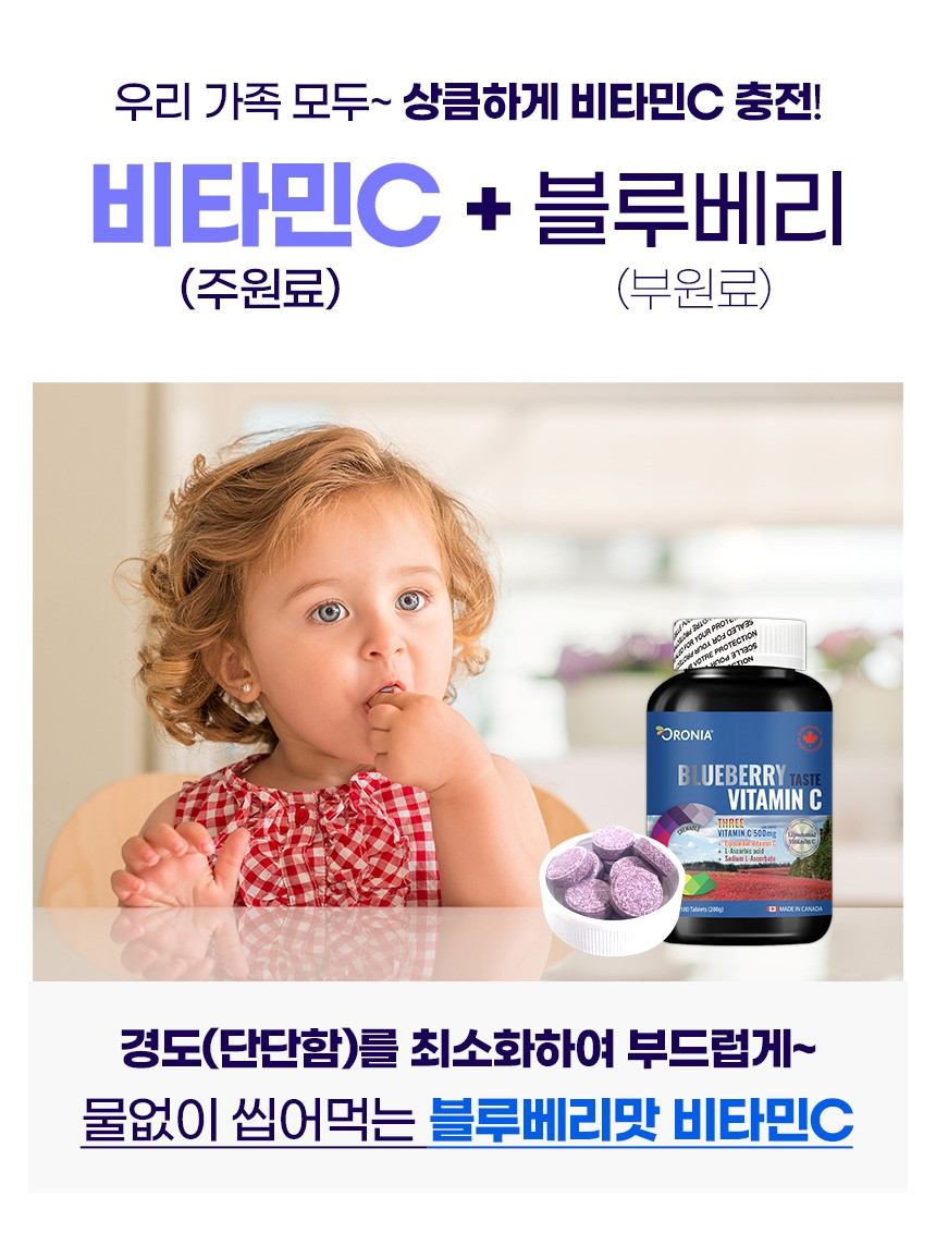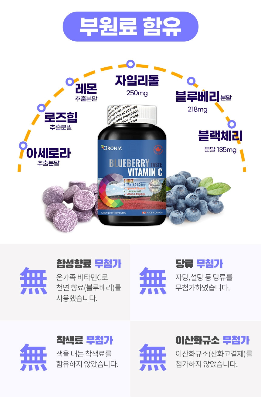 비타민C, L-아스코브산나트륨, 자일리톨, 자당, 결정셀룰로스, 블루베리분말, 스테아린산, 스테아린산마그네슘, 천연향료(블루베리향), 이산화규소(고결방지제), 레몬추출분말, 로즈힙분말, 아세로라추출분말
