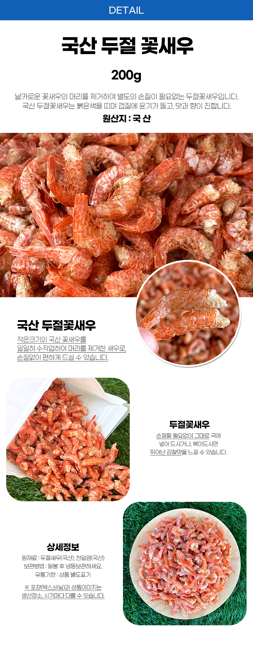 작은크기의 국산 꽃새우를 일일히 수작업하여 머리를 제거한 새우로, 손질없이 편하게 드실 수 있습니다.