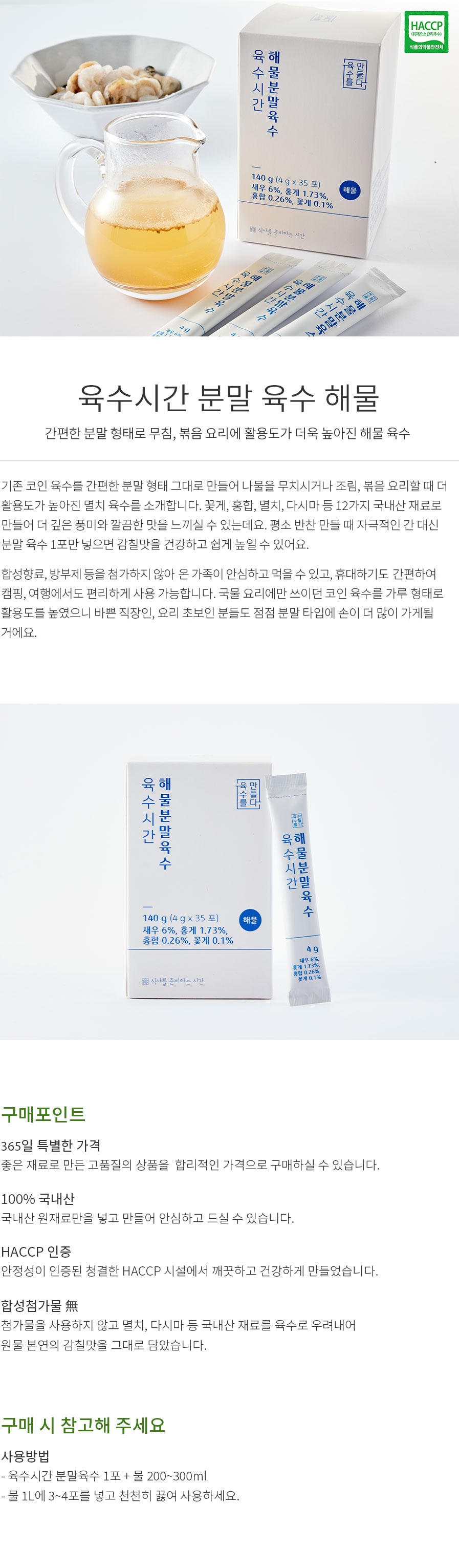 꽃게(국내산) / 홍합(국내산) / 멸치혼합분말(국내산) / 구운천일염(국내산) / 새우분말(국내산)
