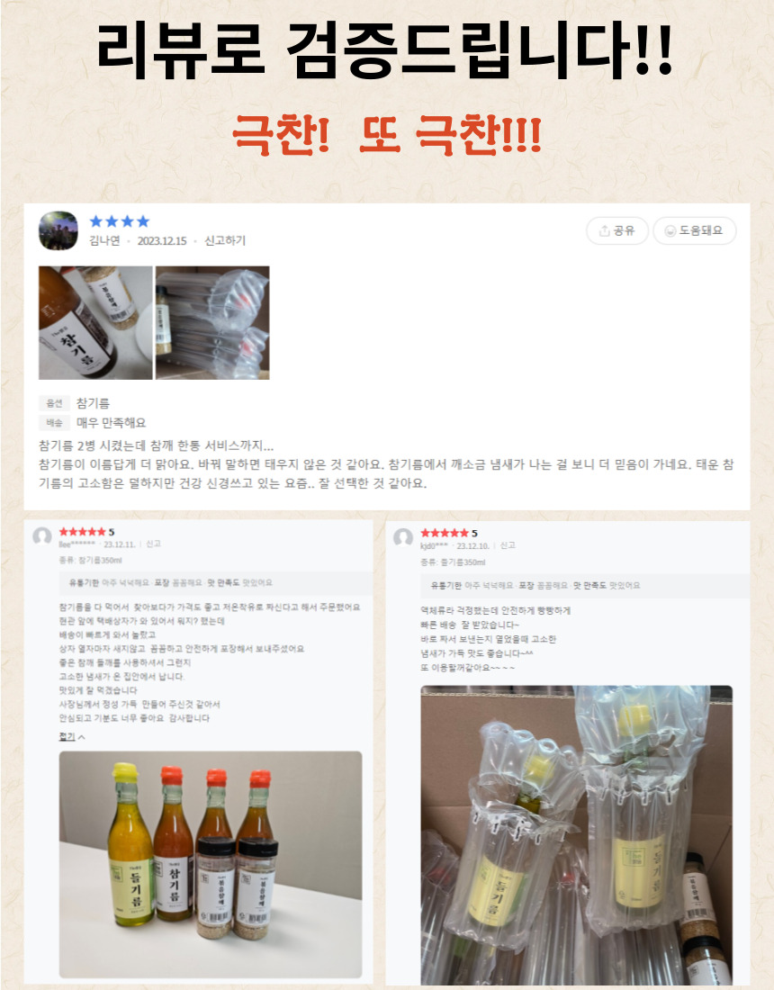 저온착유로 더욱 맑고 고소한 풍미를 가진 참기름, 들기름입니다!