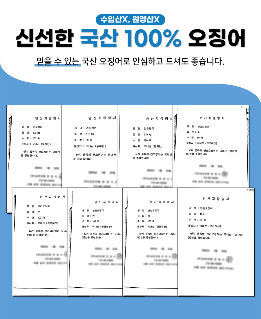 정성껏 손질 된 국내산 오징어는 딱딱하거나 질기지 않은 부드러운 오징어입니다.