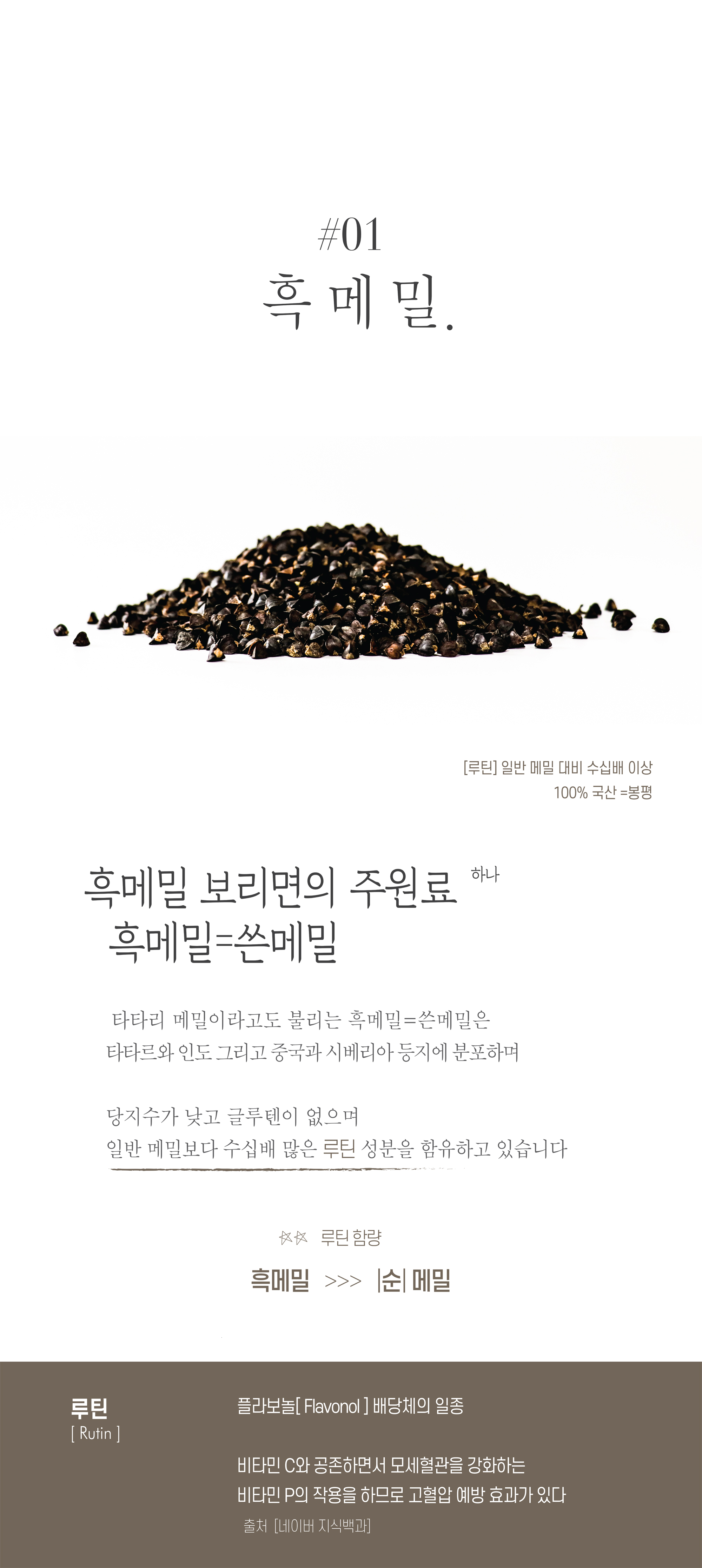 일반 메밀 대비 루틴 함량이 수십 배 많은 흑메밀을 주원료로 사용하였습니다