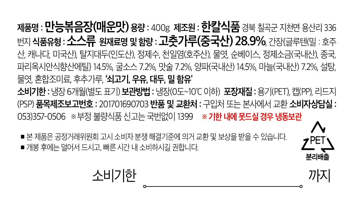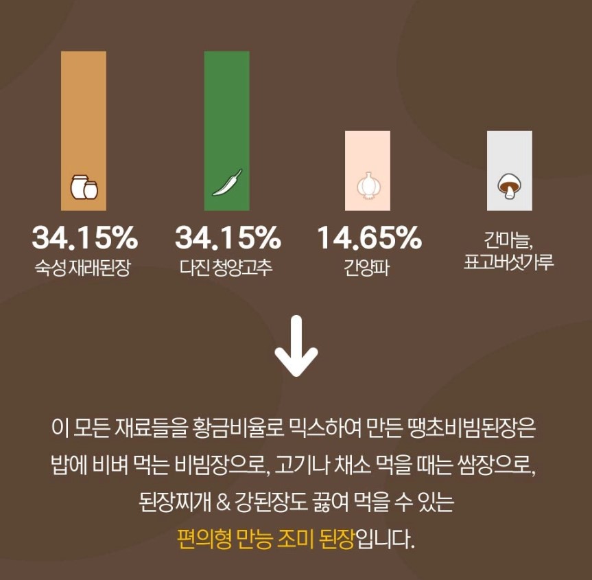 밥깡패/ 청양고추40%(국내산), 건궁채20%(중국산), 건표고15%(국내산), 무말랭이(국내산), 양파(국내산), 마늘(국내산), 간장, 액젓, 설탕, 물엿, 복합조미료, 표고가루, 대두유 소고기, 우유, 밀, 대두 함유 땡초 비빔된장 /재래된장숙성물34.15%{메주(중국산대두, 황국), 정제염, 정제수}, 청양 고추(국내산) 34.15%, 간 양파(국내산)14.65%, 재래된장숙성물34.15%{메주(중국산대두, 황국), 정제염, 정제수}, 청양 고추(국내산) 34.15%, 간 양파(국내산)14.65%, 간 마늘(국내산), 물엿, 대두유, 백설탕, 혼합조미료, 표고버섯가루, 맛술, ‘쇠고기,우유, 대두,밀 함유’ 만능볶음장/ 고춧가루(중국산) 28.9%, 간장{글루텐(밀:호주산, 캐나다, 미국산}, 탈지대두(인도산), 정제수, 천일염(호주산), 물엿, 순베이스, 정제소금(국내산), 종국, 파리옥시안식향산에틸} 14.5%, 굴소스 7.2%, 맛술 7.2%, 양파(국내산) 14.5%, 마늘(국내산) 7.2%, 설탕, 물엿, 혼합조미료, 후추가루 '쇠고기, 우유, 대두 밀 함유'