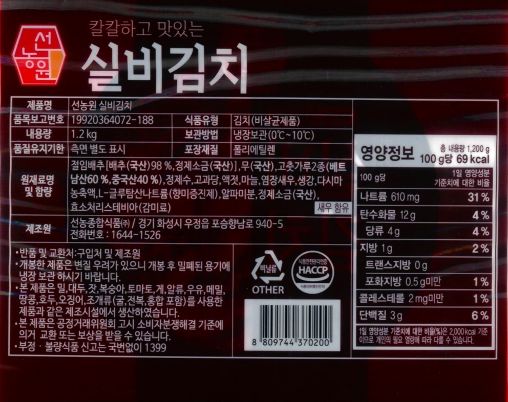 선농원 실비김치 1.2kg (100% 국내산 배추)