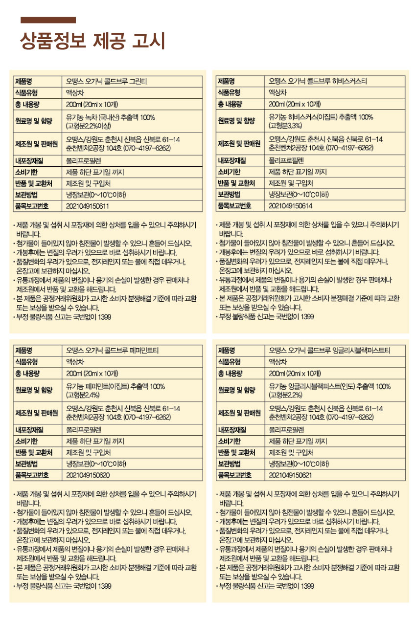 • [정기배송] 오땡스 오가닉 콜드브루티 그린티 히비스커스티 페퍼민트티 잉글리시블랙퍼스트티 200ml (20mlx10입)