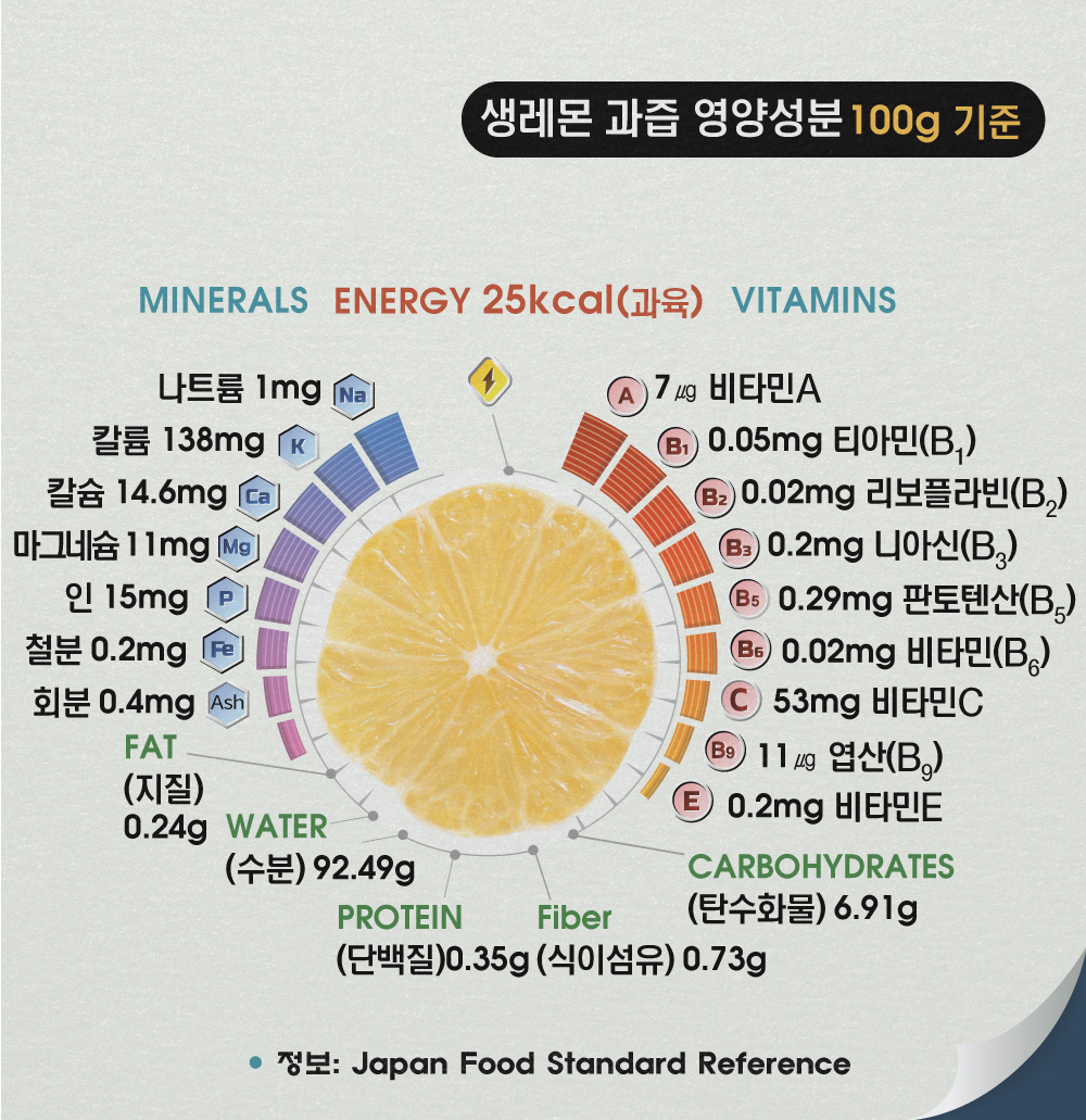 100g기준 탄수화물 8.16g, 지방 0.02g, 트랜스지방 0g, 나트륨 1.768mg, 회분 0.22g, 단백질 0.42g, 포화지방 0.01g, 당류 2.27g, 비타민C 38.28mg, 수분 91.18g
