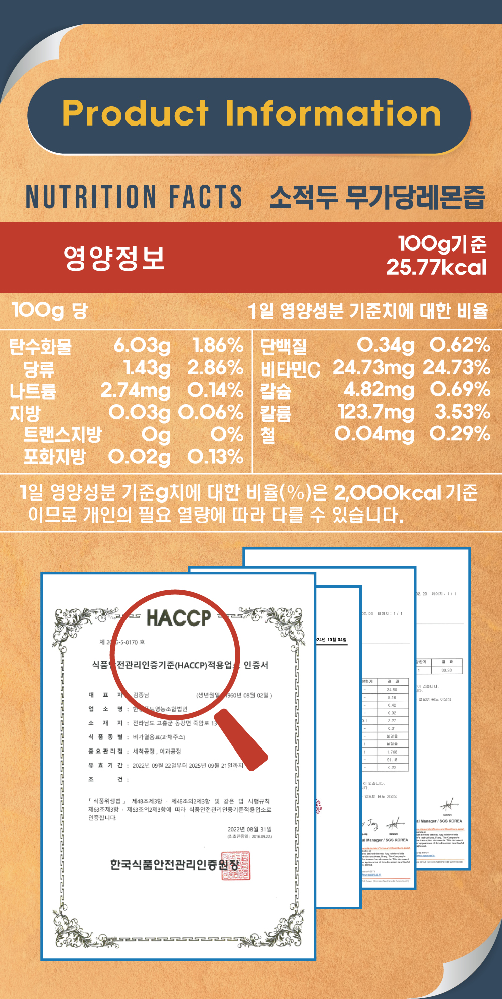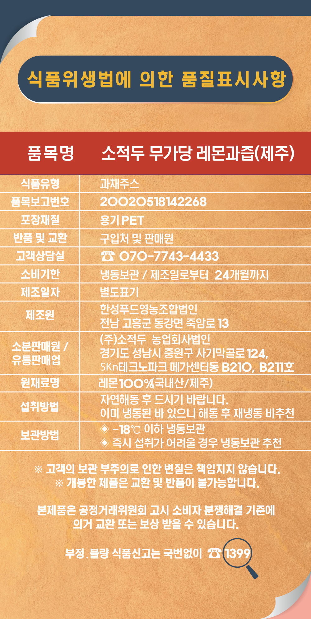 제조원 : 한성푸드영농조합법인 / 유통소분판매 : (주)소적두 농업회사법인 한성푸드영농조합법인 : 전라남도 고흥군 동강면 죽암로 13 / (주)소적두 농업회사법인 : 경기도 성남시 중원구 사기막골로 124, 메가센터 B210, B211