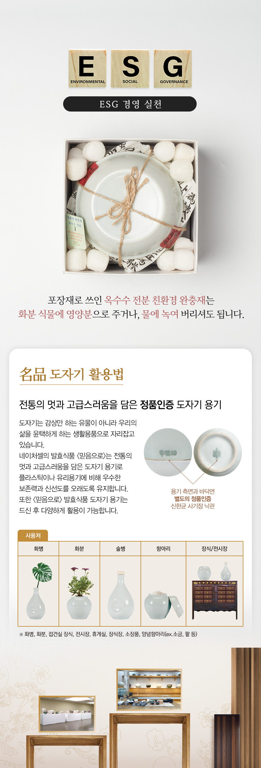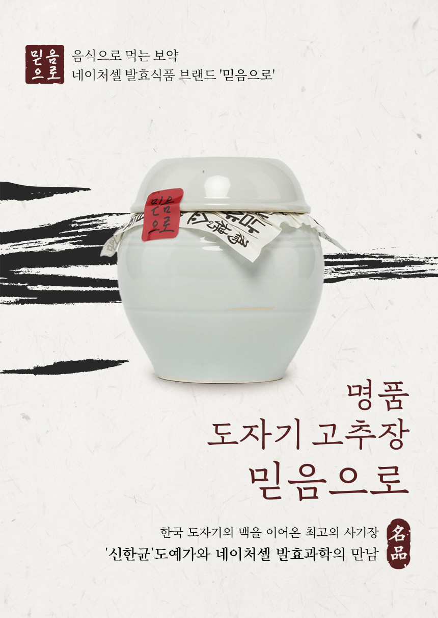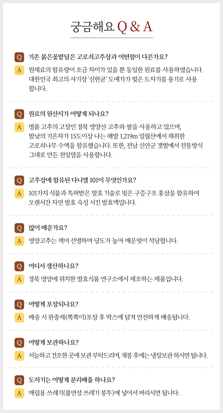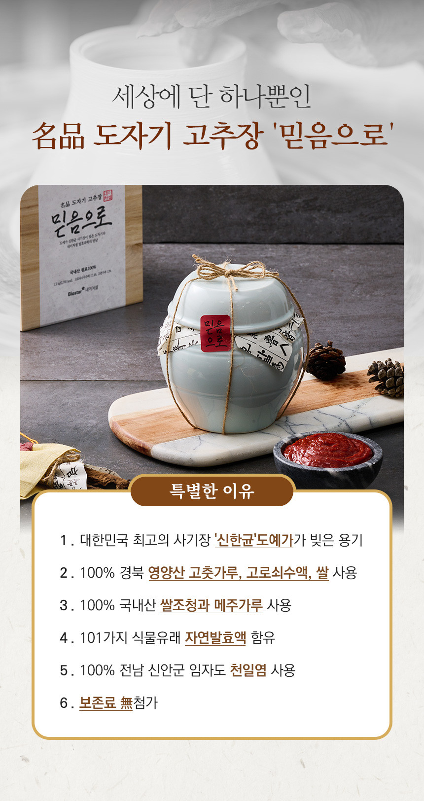 100%국내산! 경북영양 명품 빛깔찬 고춧가루와 101가지 자연발효액을 사용하여 만든 고추장을 대한민국 최고의 사기장 '신한균'도예가가 빚은 용기에 담았습니다.