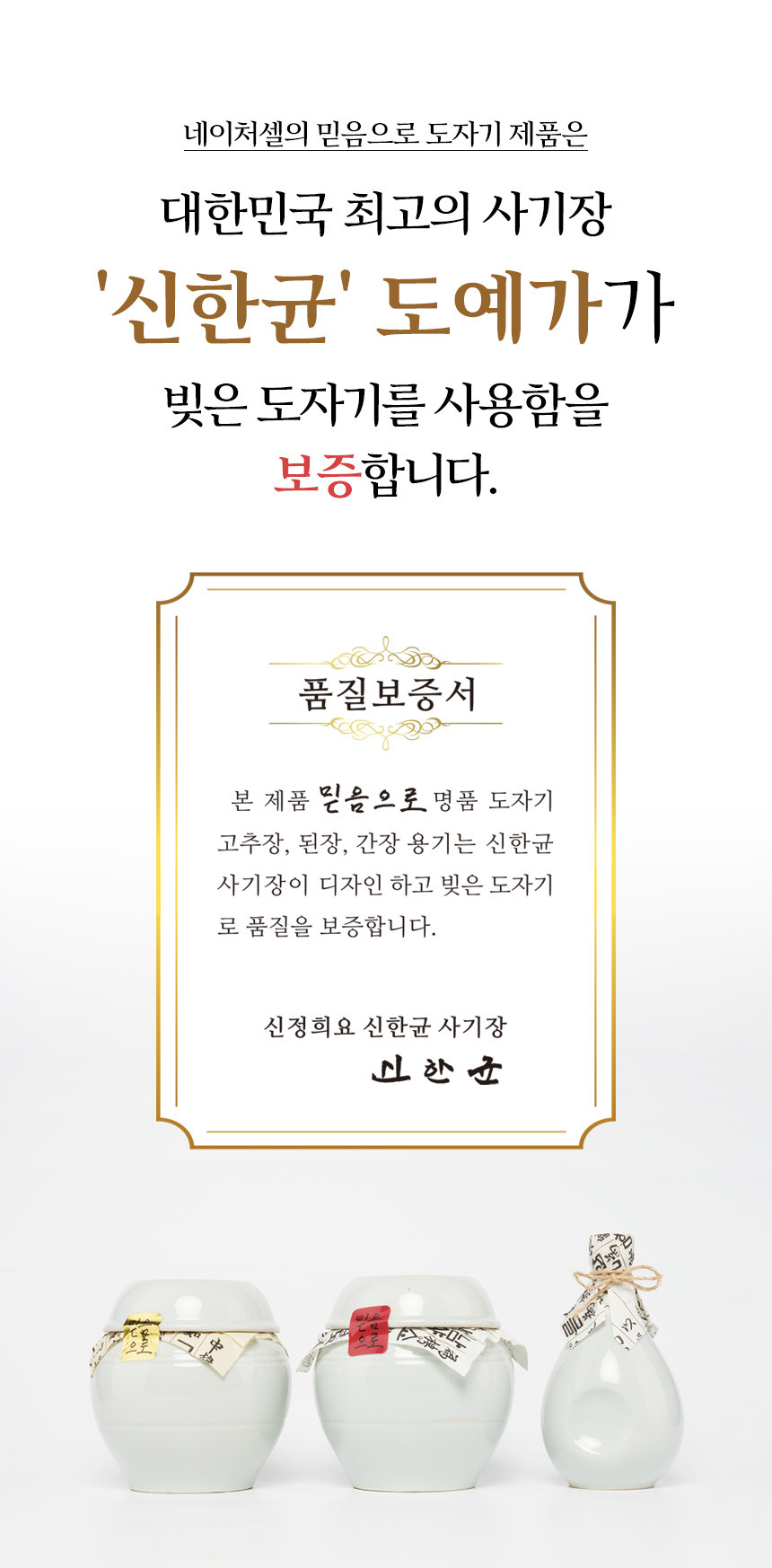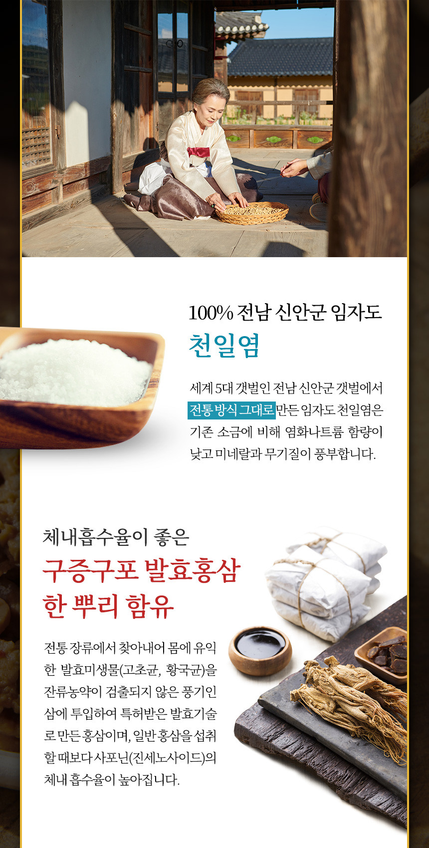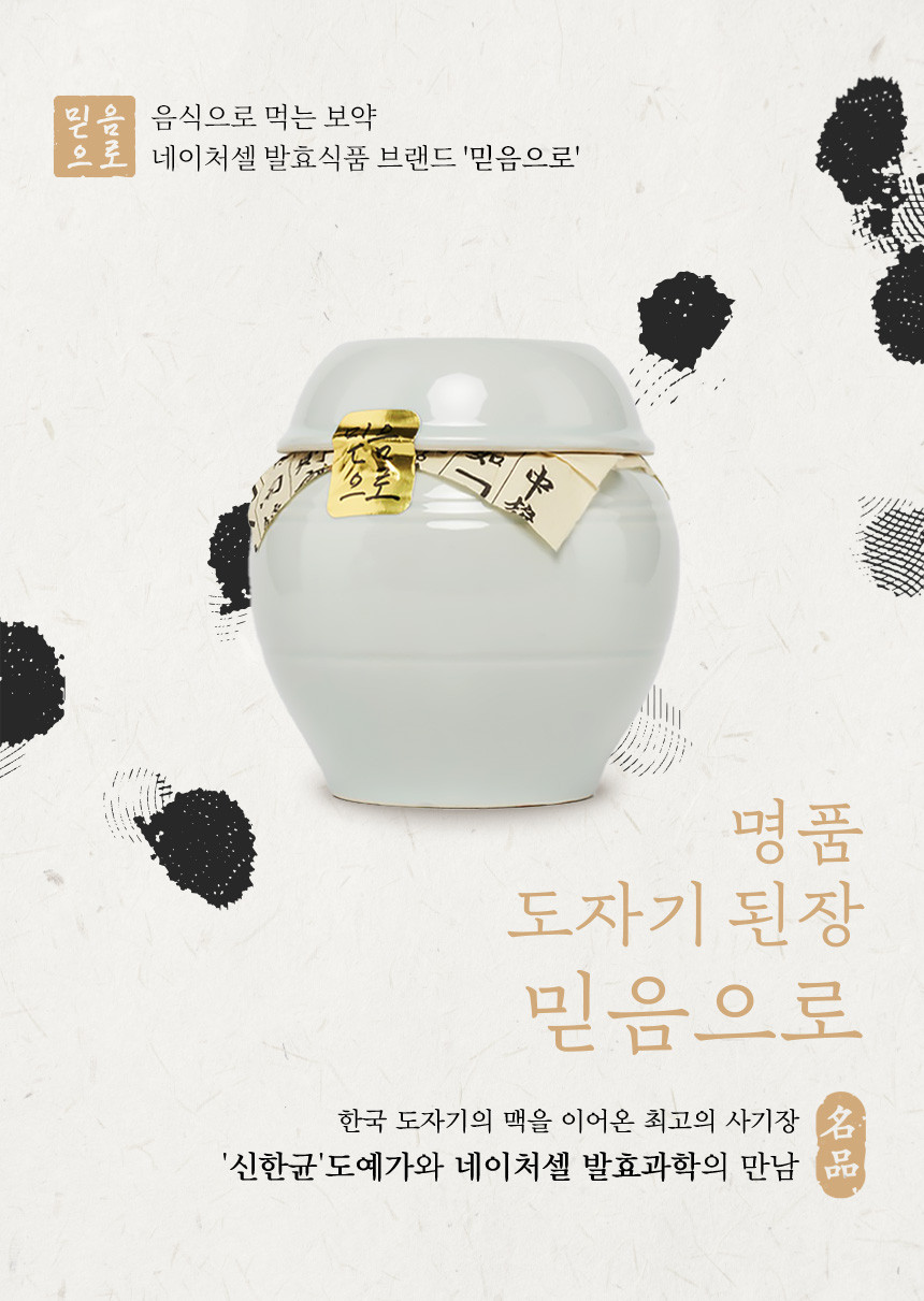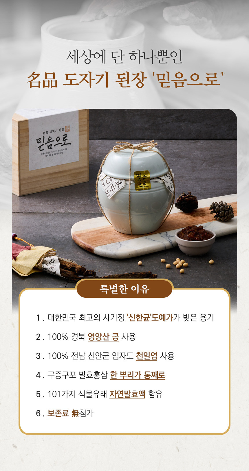 100%국내산! 구증구포 발효홍삼 한뿌리와 101가지 자연발효액을 사용하여 만든 된장을 대한민국 최고의 사기장 '신한균'도예가가 빚은 용기에 담았습니다.