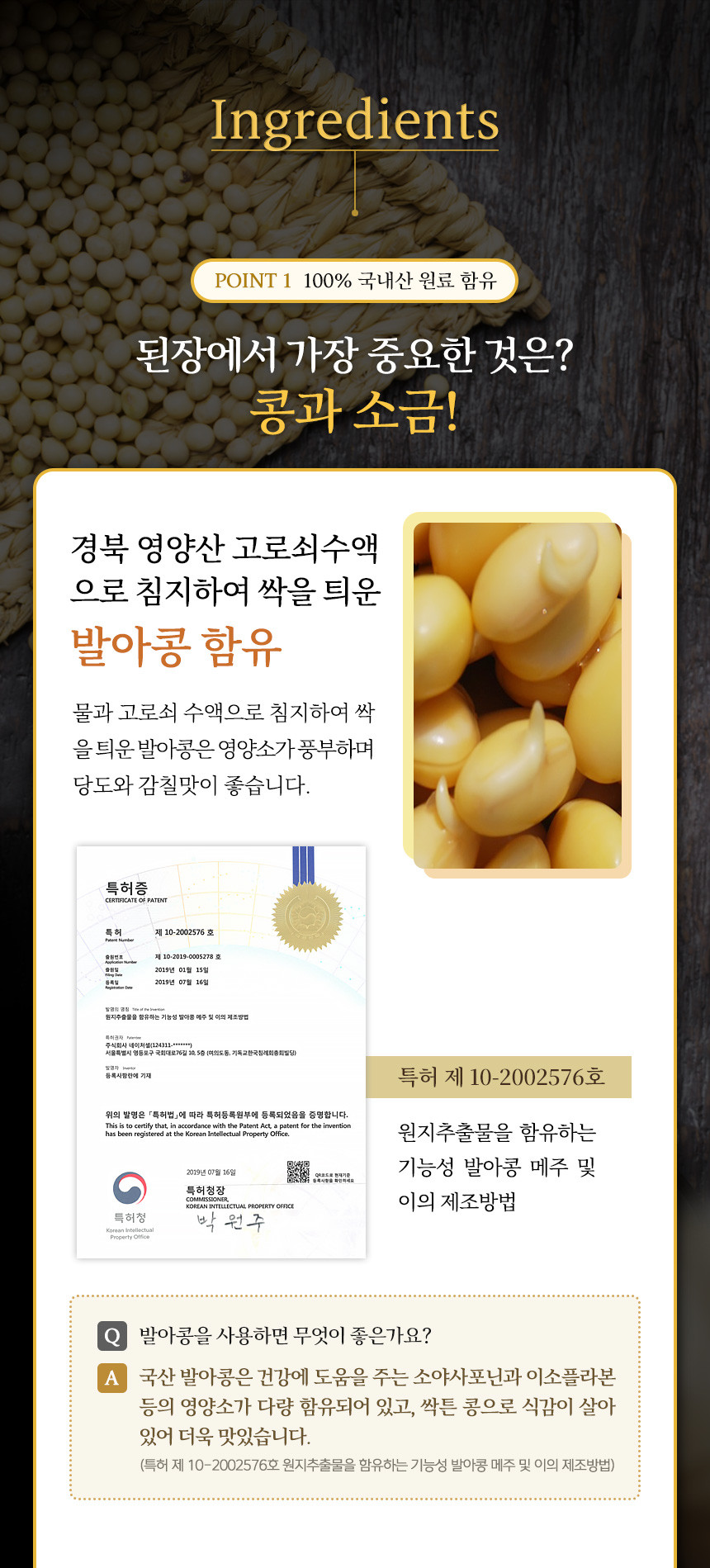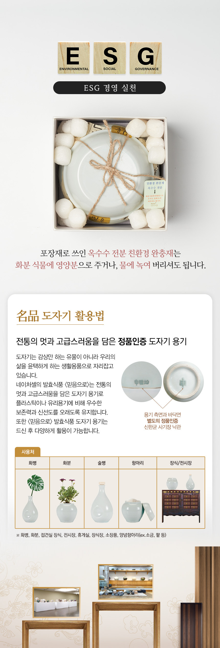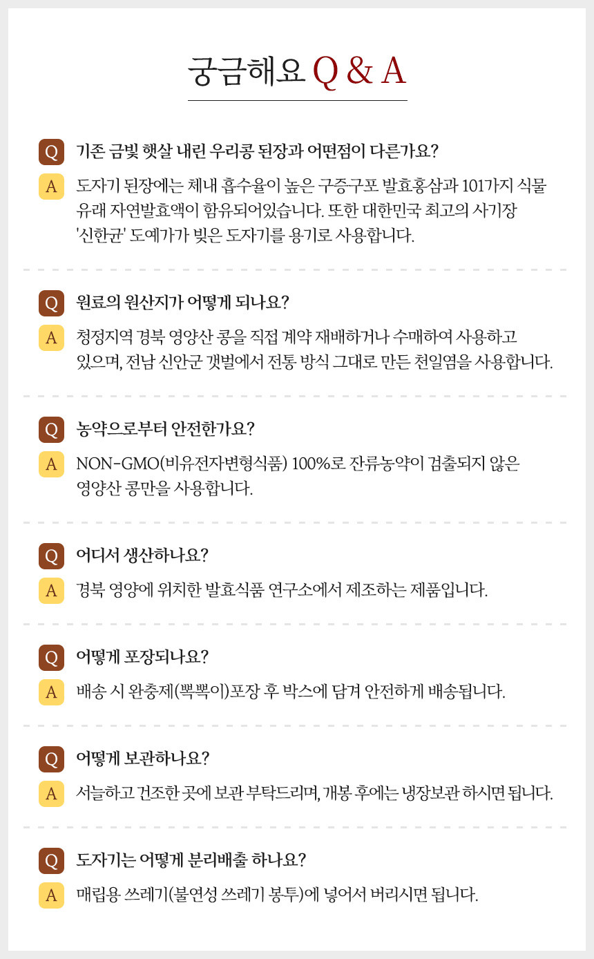100%국내산! 구증구포 발효홍삼 한뿌리와 101가지 자연발효액을 사용하여 만든 된장을 대한민국 최고의 사기장 '신한균'도예가가 빚은 용기에 담았습니다.
