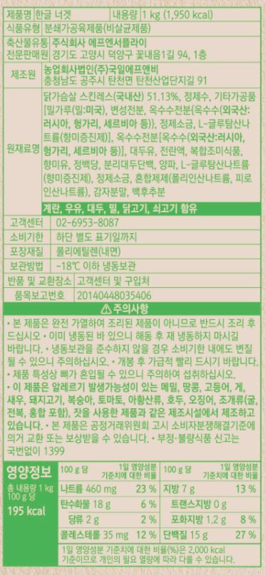닭가슴살 스킨레스(국내산)51.13%,정제수,기타가공품[밀가루(밀:미국),변성전분{옥수수(외국산:러시아,헝가리,세르비아 등)},정제소금,L-글루탐산나트륨(향미증진제)},옥수수전분 [옥수수(외국산:러시아,헝가리,세르비아등)],대두유,전란약,복합조미식품,향미유,정백당,분리대두단백,양파,혼합제제(폴리인산나트륨,피로인산나트륨),감자분말,백후추분 계란,우유,대두,밀,닭고기,쇠고기 함유