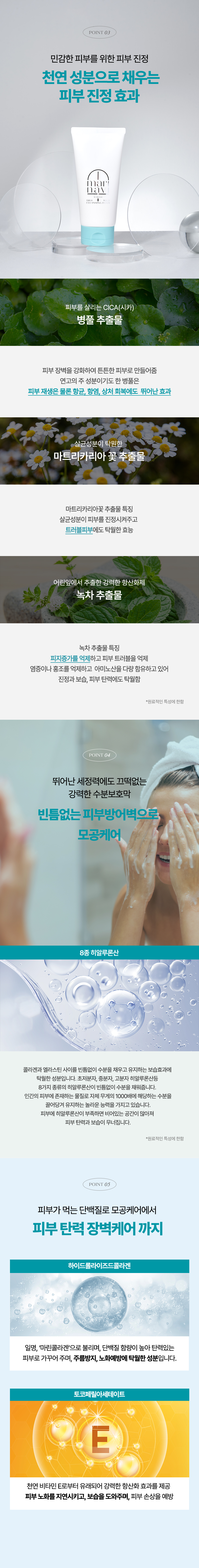 정제수, 팔미틱애씨드, 스테아릭애씨드, 라우릭애씨드, 미리스틱애씨드, 포타슘하이드록사이드, 글리세린, 피이지-90, 코카미도프로필베타인, 글리세릴스테아레이트, 미역추출물, 다시마추출물, 칼슘카보네이트, 소듐하이알루로네이트, 하이드롤라이즈드콜라겐, 폴리글루타믹애씨드, 병풀잎추출물, 카프릴릴글라이콜, 녹차추출물, 마트리카리아꽃추출물, 하이드롤라이즈드하이알루로닉애씨드, 하이드롤라이즈드소듐하이알루로네이트, 소듐하이알루로네이트크로스폴리머, 포타슘하이알루로네이트, 하이알루로닉애씨드, 하이드록시프로필트라이모늄하이알루로네이트, 펜틸렌글라이콜, 소듐아세틸레이티드하이알루로네이트, 피이지-100스테아레이트, 폴리쿼터늄-7, 포타슘코코일글리시네이트, 소듐클로라이드, 다이소듐이디티에이, 카보머, 피이지-14M, 1,2-헥산다이올, 토코페릴아세테이트, 소듐폴리아크릴레이트