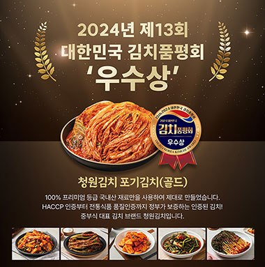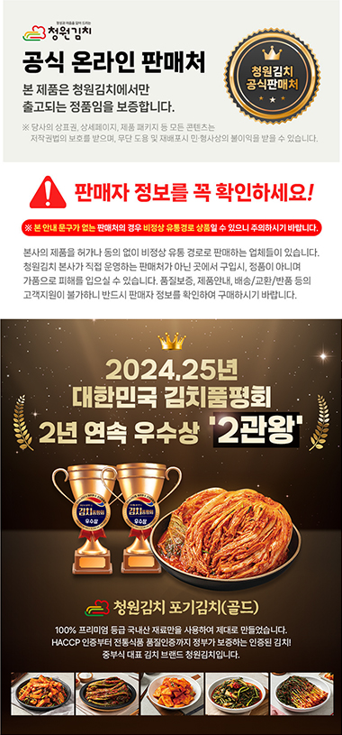 24년도 김치품평회 우수상 수상, 국내산 재료 100%, 청원 비법육수 사용으로 깊은 감칠맛