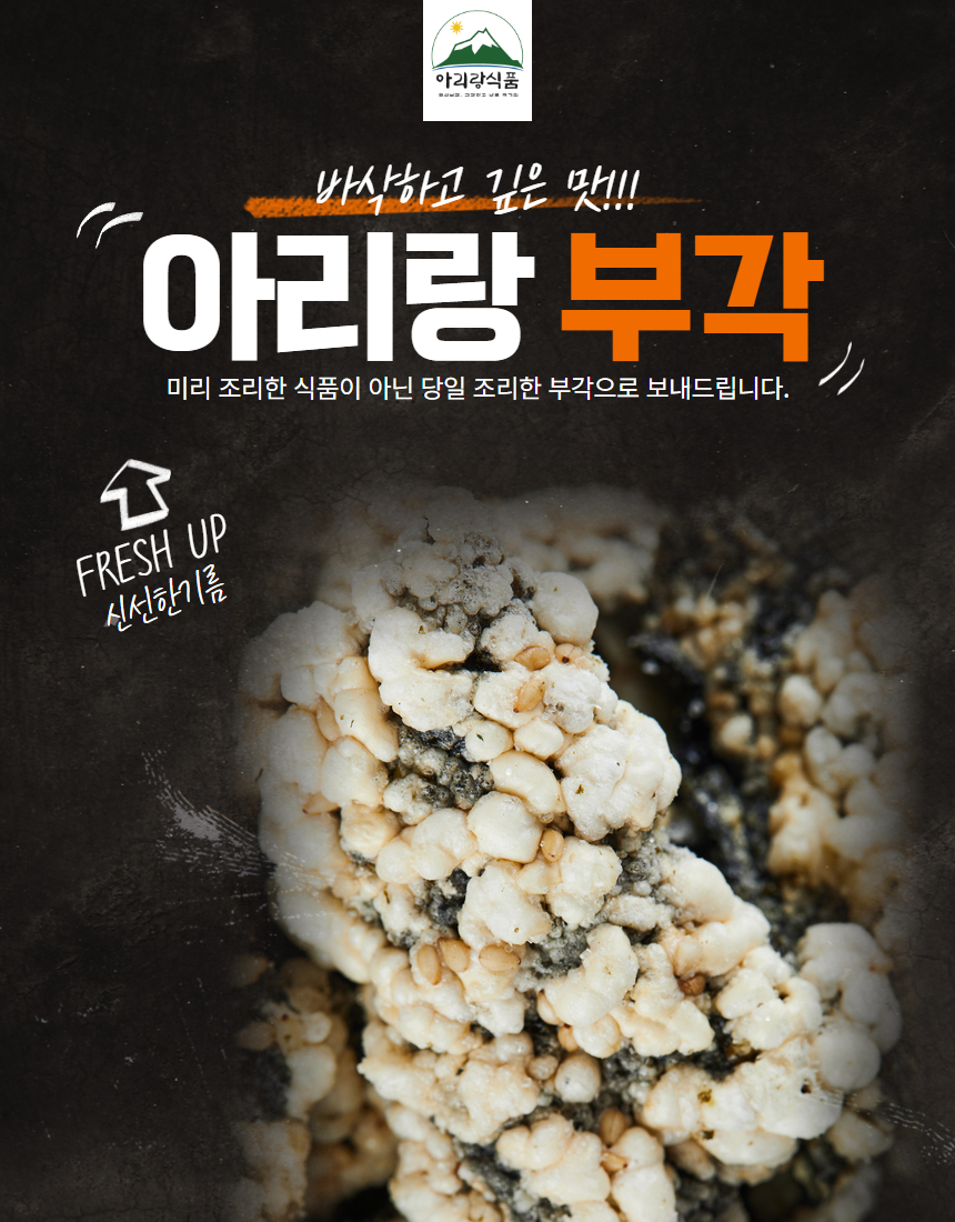 고추부각: 고추(고추열매70%,찹쌀30%)97%, 콩기름,설탕,정제소금,시즈닝믹스 김부각: 김(반제품김 60%,찹쌀40%)93%, 콩기름,정제소금,설탕,시즈닝믹스,참깨 어포튀각: 조미생선포99%((연육(어육살93.8%,설탕,솔비톨,폴리인산나트륨,설탕,전분곡류가공품,정제소금,팽창제,L-글루나트륨,대두유